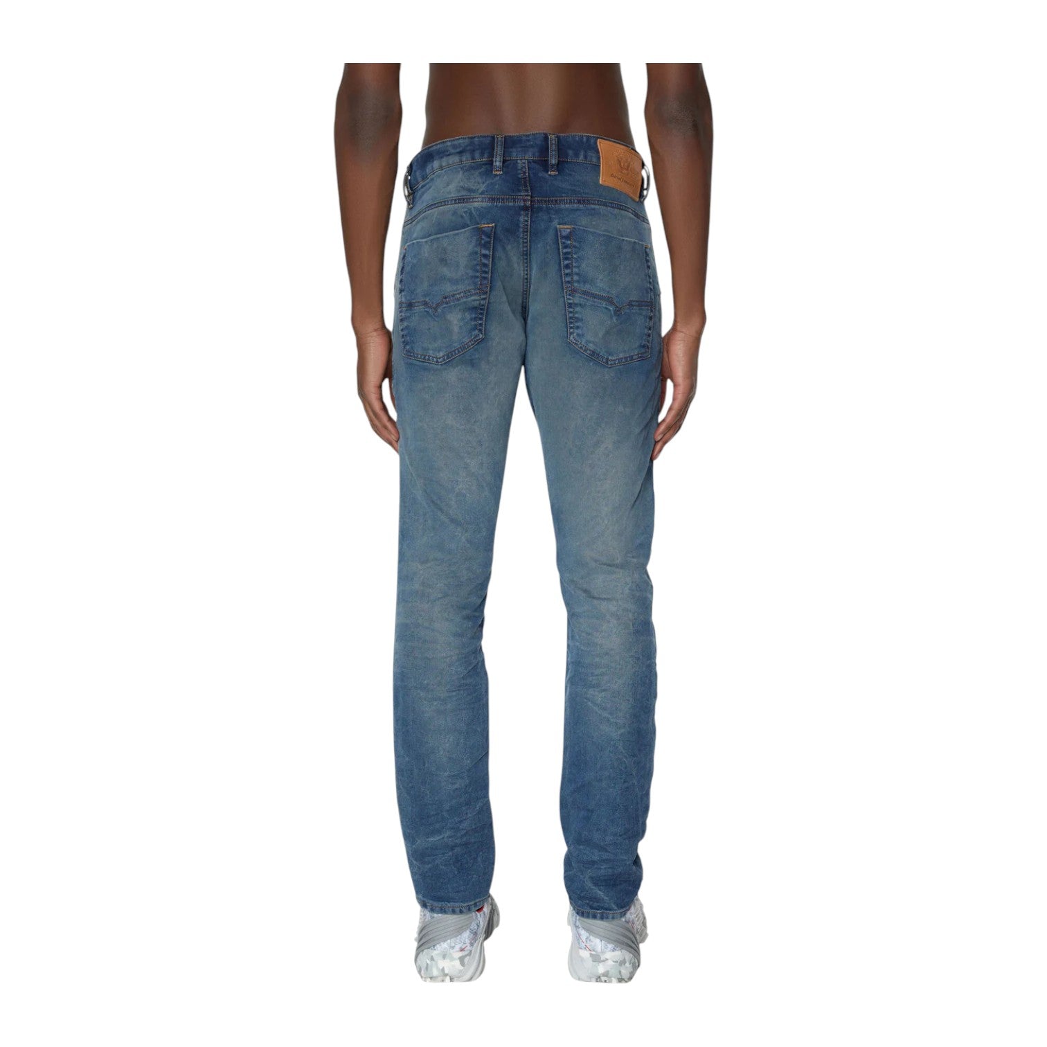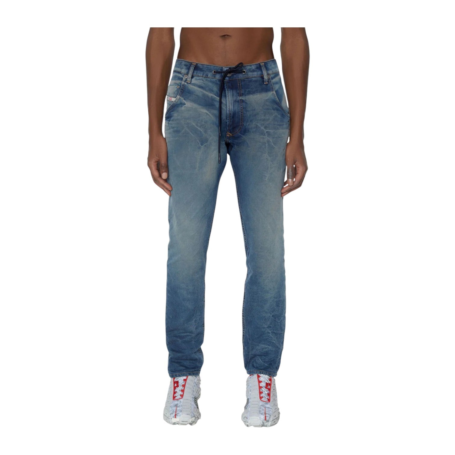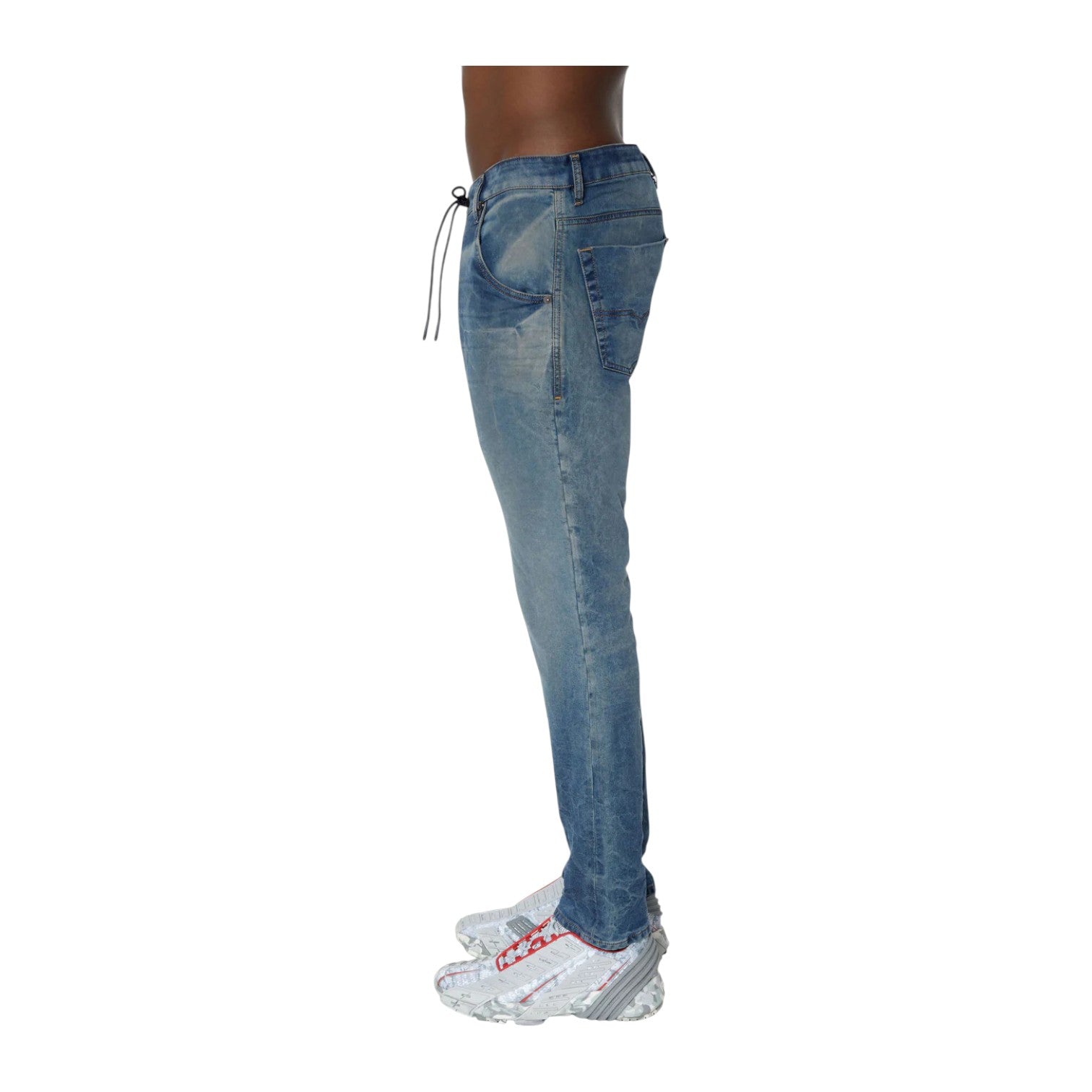 Crafted from premium JoggJeans® fabric with a mid-rise fit and tapered leg, they deliver a sleek silhouette that pairs effortlessly with tees, hoodies, or boots. Featuring a comfortable elastic waistband and subtle washed details, these jeans bring a contemporary edge to your casual wardrobe while staying true to Diesel’s signature aesthetic.